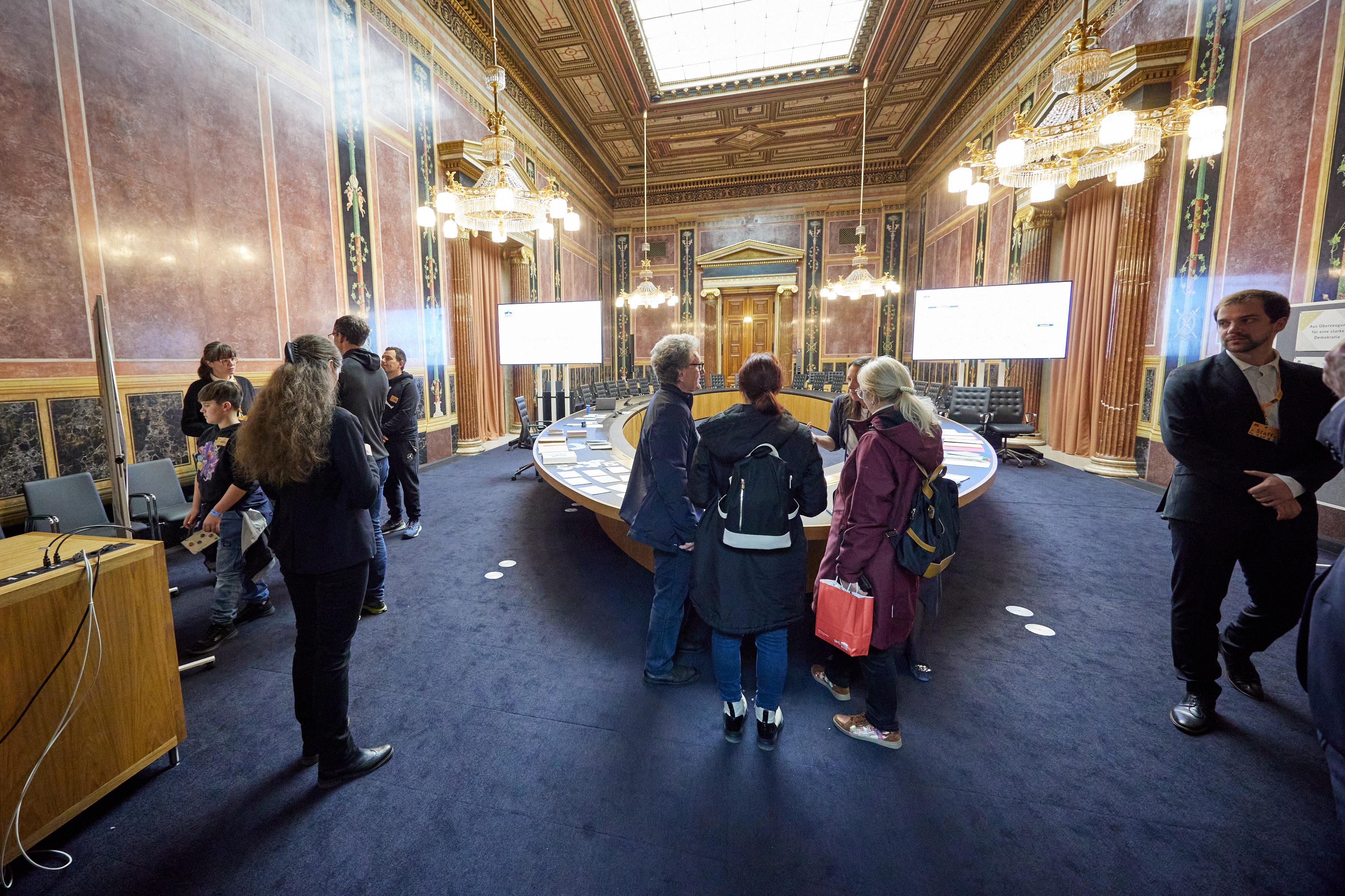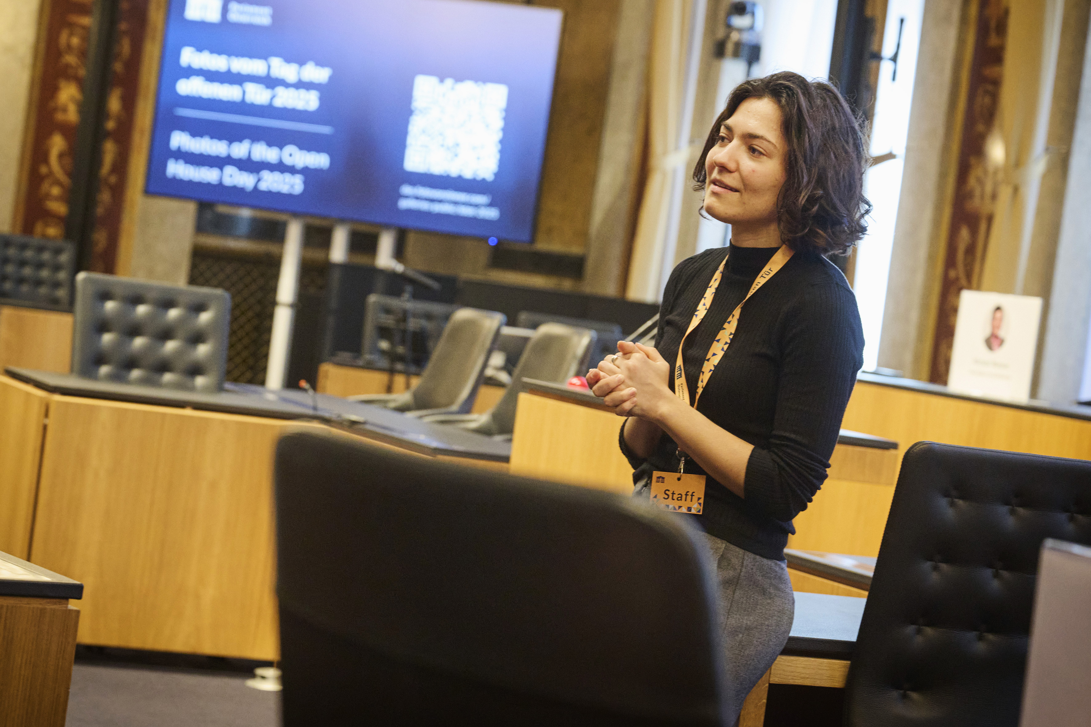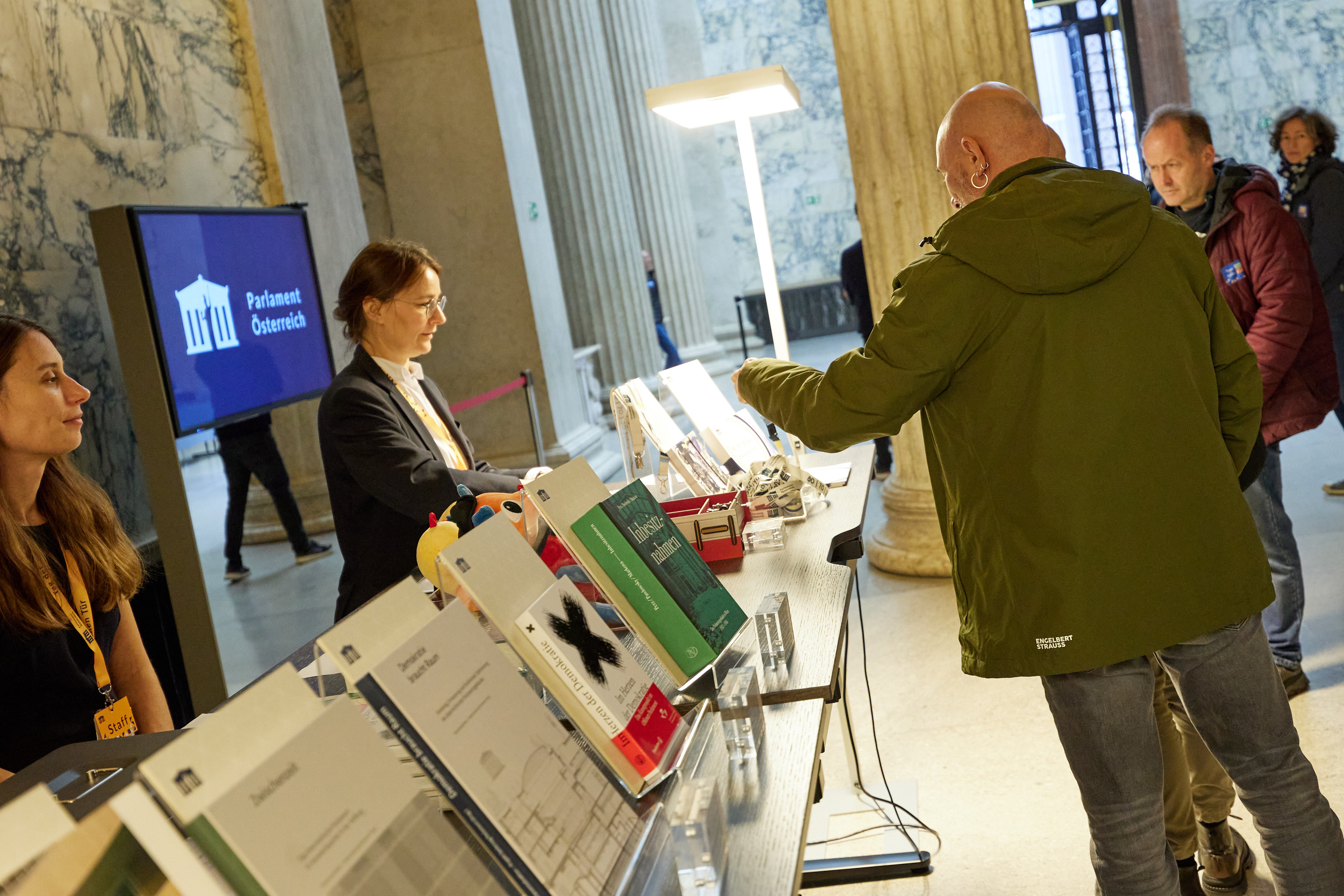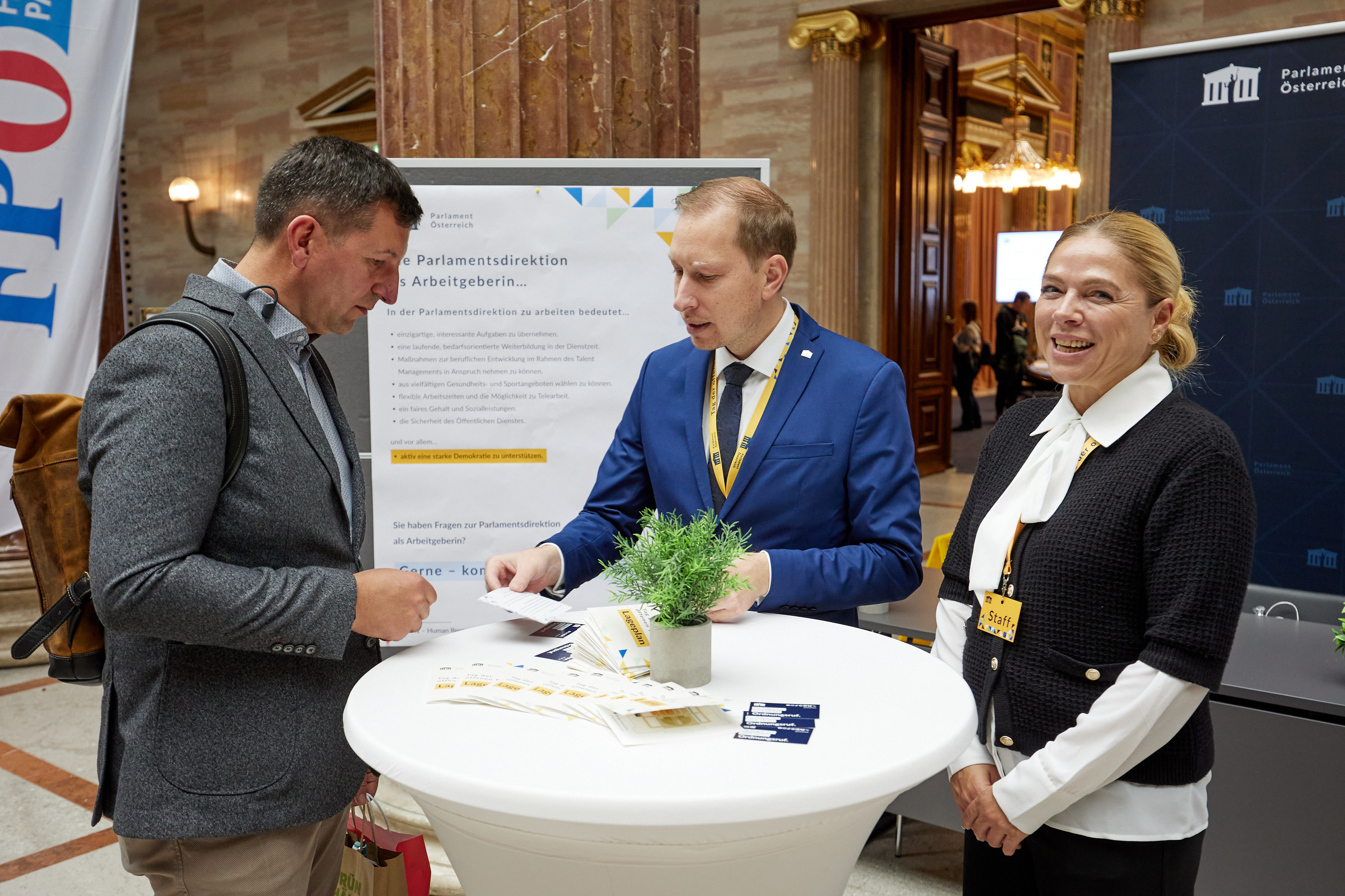 Mitarbeiterinnen und Mitarbeiter der Parlamentsdirektion präsentieren ihre Dienste